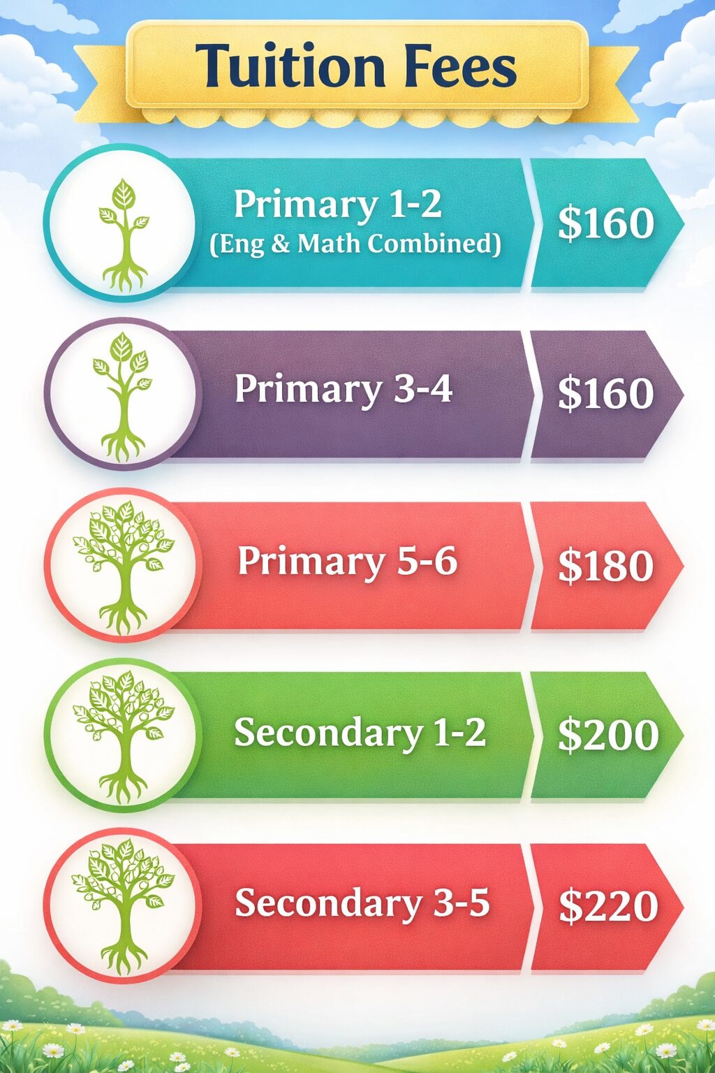 Our fees are kept affordable and transparent, with each monthly package consisting of 4 lessons per subject (English, Math and Science).